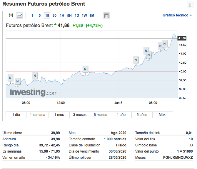 Los futuros del crudo Brent se negociaban cerca de los 42 dólares el barril. En tanto, los futuros del petróleo estadounidense WTI superaban los 38 dólares.