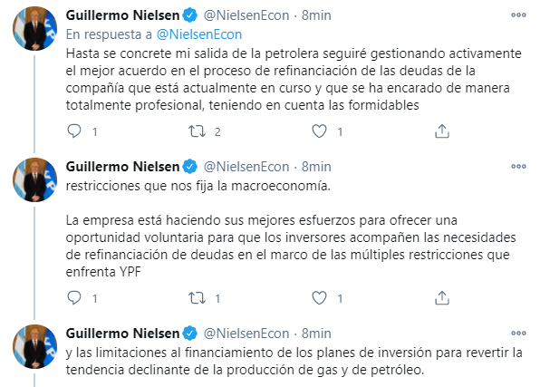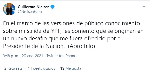 Tras horas en las que se especuló sobre su desplazamiento y lo que diría, Nielsen prefirió utilizar su cuenta de twitter para hablar de su retiro de YPF, en momentos en que las acciones de la firma caen 7% en la Bolsa de Buenos Aires y los ADrs que cotizan en Nueva York retroceden 6,2%.